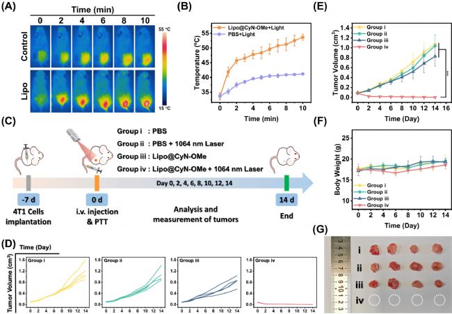 接著研究者在荷瘤小鼠模型中評估了Lipo@CyN-OMe的光熱治療效果。活體光熱成像顯示:PBS+1064 nm激光組僅出現(xiàn)輕微溫升(ΔT≈7℃),而Lipo@CyN-OMe+1064 nm激光組的腫瘤部位溫度快速升高(ΔT≈21℃)(圖5A,B),證實了該體系在體內(nèi)的高效光熱轉(zhuǎn)換能力。為系統(tǒng)評估治療效果,在腫瘤體積達100 mm³時將小鼠隨機分為四組(n=5):(i)PBS對照組、(ii)PBS+1064 nm激光組、(iii)Lipo@CyN-OMe組、(iv)Lipo@CyN-OMe+1064 nm激光組(圖5C)。單次給藥6小時后進行1064 nm激光照射(1 W·cm⁻²,10分鐘),隨后14天內(nèi)隔日監(jiān)測腫瘤體積與體重變化。結(jié)果顯示(圖5D-F):所有組別均未出現(xiàn)顯著體重下降;但相較于前三組腫瘤的快速生長,Lipo@CyN-OMe+激光組完全抑制了腫瘤進展,且后續(xù)觀察期間未見復(fù)發(fā)(圖5G)。