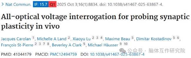 2025年10月3日,英國(guó)倫敦大學(xué)學(xué)院沃爾夫森生物醫(yī)學(xué)研究所Jacques Carolan團(tuán)隊(duì)在Nature communications上發(fā)表了一篇名為“All-optical voltage interrogation for probing synaptic plasticity in vivo ”的研究論文,該文章結(jié)果為定義清醒動(dòng)物在行為過程中已識(shí)別突觸處的可塑性誘導(dǎo)規(guī)則提供了藍(lán)圖。