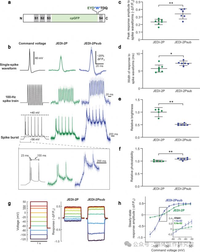 為測(cè)量浦肯野細(xì)胞(PC)的突觸后電位,研究團(tuán)隊(duì)先對(duì)原有基因編碼電壓指示器(GEVI)JEDI-2P 進(jìn)行優(yōu)化,在其 GFP 與電壓傳感結(jié)構(gòu)域間插入色氨酸。優(yōu)化后指標(biāo)單尖峰電壓響應(yīng)更大、光穩(wěn)定性更好,且電壓敏感性轉(zhuǎn)向更負(fù)膜電位,對(duì)靜息膜電位附近電壓變化的響應(yīng)提升 3.5 倍(這是報(bào)告突觸后電位的關(guān)鍵),該優(yōu)化指標(biāo)被命名為 JEDI-2Psub,突出其對(duì)亞閾值響應(yīng)的更高靈敏度。