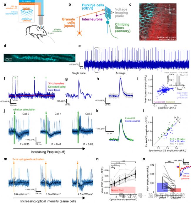 對(duì)小鼠胡須墊加氣吸刺激,PC 樹突出現(xiàn)抑制性或興奮性反應(yīng),其中興奮性反應(yīng)的波形與自發(fā)復(fù)雜尖峰幾乎一致,確認(rèn)由 CF 驅(qū)動(dòng)。光遺傳學(xué)激活 GrC 時(shí),PC 常出現(xiàn)隨刺激強(qiáng)度增強(qiáng)的分級(jí)超極化,加巴嗪可顯著減弱該反應(yīng),證實(shí)是 GABA 介導(dǎo)的抑制性突觸后電位(IPSP);偶爾也會(huì)引發(fā)去極化,且僅視蛋白小鼠光刺激無反應(yīng)、PC 復(fù)雜尖峰在記錄全程及不同小鼠間無顯著變化。綜上,該方法能全光學(xué)誘發(fā)并解析 IPSP。