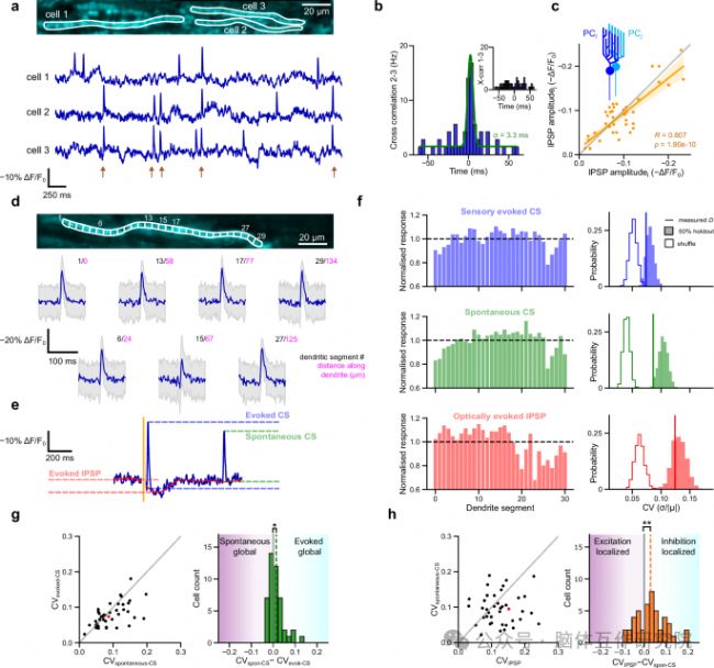 團(tuán)隊(duì)還將單個(gè) PC 樹突分割為~5μm 段分析,發(fā)現(xiàn)感覺誘發(fā)和自發(fā)復(fù)雜尖峰在樹突樹中分布均勻,符合攀爬纖維輸入廣泛分布的特點(diǎn);而 IPSP 分布更異質(zhì),可能因抑制性突觸輸入激活離散不均導(dǎo)致。且復(fù)雜尖峰與 IPSP 均和基線熒光無關(guān),證明變化具有生理性。