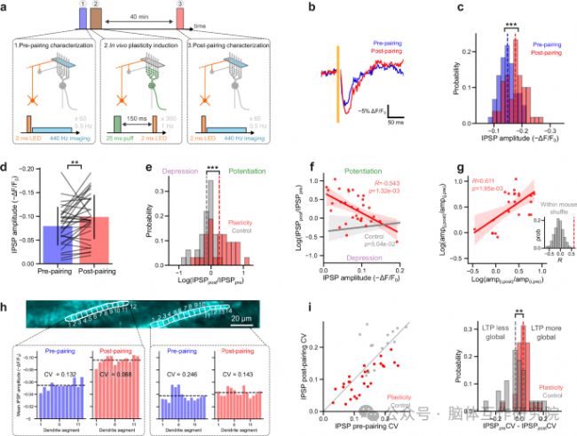 分析顯示,基線 IPSP 較小的 PC,LTP 更大;相鄰 PC 的 LTP 大小高度相關(guān),可塑性誘導(dǎo)后其 IPSP 信號(hào)相關(guān)性顯著提高;LTP 還伴隨 PC 樹突上 IPSP 分布變異性降低,而復(fù)雜尖峰空間分布無明顯變化。這表明該方法可在體內(nèi)光學(xué)觸發(fā)和監(jiān)測(cè)多個(gè)樹突及 PC 的可塑性。