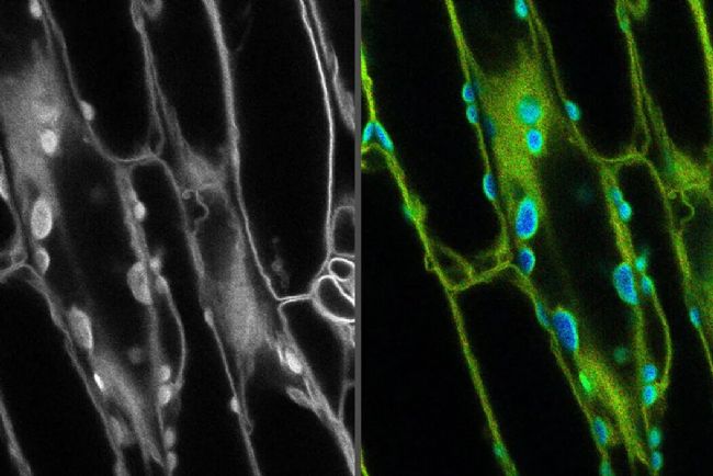 圖2:左邊的熒光顯微鏡圖像,不能區(qū)分熒光信號和背景自發(fā)熒光。在右邊的圖像中,熒光壽命被用來區(qū)分葉綠體中的自發(fā)熒光(藍(lán)色)和所需的細(xì)胞膜熒光信號(綠色)。
