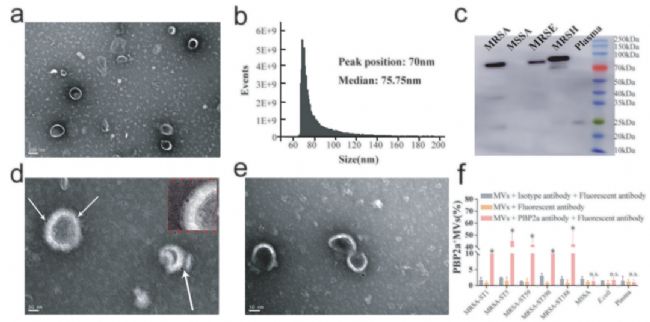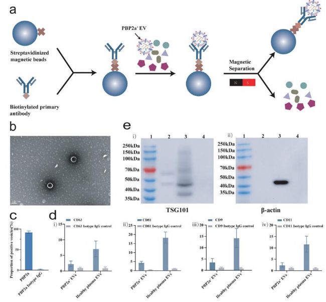 為了探究血漿中 PBP2a⁺ EVs 的來源,研究團(tuán)隊(duì)通過鏈霉親和素磁珠結(jié)合生物素化的 PBP2a 抗體,從 MRSA 血流感染患者血漿中捕獲 PBP2a⁺ EVs。經(jīng) TEM 觀測(cè)到完整的形態(tài)。同時(shí),NanoFCM 結(jié)果顯示捕獲的 PBP2a⁺ EVs 純度超 90%(圖2c);進(jìn)一步利用 NanoFCM 檢測(cè)人源性的 EV 經(jīng)典標(biāo)志物,發(fā)現(xiàn) PBP2a⁺ EVs 表達(dá)經(jīng)典標(biāo)志物(CD63、CD81、CD9、CD11)的陽性率僅 3%-5%,顯著低于健康人血漿 EVs (7%-21%,圖2d);WB 也僅檢測(cè)出微量 TSG101(圖2e)。上述結(jié)果表明,MRSA 血流感染患者血漿中的 PBP2a⁺ EVs 主要來源于細(xì)菌,其特異性不受血漿中其他細(xì)胞來源影響,可作為 MRSA 感染的潛在標(biāo)志物。