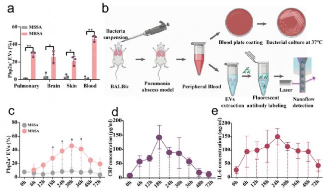 選取肺炎、腦膜炎、皮膚膿腫、血流感染 4 種 BALB/c 小鼠感染模型,以 MRSA(ST398 菌株)為研究對(duì)象,MSSA 感染組為對(duì)照,并在感染后 0-72 h 內(nèi)多個(gè)時(shí)間點(diǎn)采集血液樣本。利用 NanoFCM 分析 PBP2a⁺ EVs 比例,同時(shí)通過酶聯(lián)免疫吸附試驗(yàn)(ELISA)檢測(cè) C 反應(yīng)蛋白(CRP)與白細(xì)胞介素-6(IL-6)等非特異性炎癥標(biāo)志物的水平,以驗(yàn)證 PBP2a⁺ EVs 與感染炎癥的關(guān)聯(lián)性。NanoFCM 結(jié)果顯示,所有 MRSA 感染模型小鼠血漿中 PBP2a⁺ EVs 比例均顯著高于 MSSA 感染對(duì)照組;MSSA 感染組幾乎檢測(cè)不到 PBP2a⁺ EVs,證明 PBP2a⁺ EVs 能夠特異性辨別 MRSA 感染(圖3a)。此外,在肺炎模型中,MRSA 感染后 6 h 即可檢出 PBP2a⁺ EVs,早于傳統(tǒng)炎癥標(biāo)志物的臨床預(yù)警窗口;PBP2a⁺ EVs 比例隨感染進(jìn)展逐步升高,30 h 達(dá)到峰值,隨后逐漸下降,該變化趨勢(shì)與 CRP 和 IL-6 一致(圖3c-e)。PBP2a⁺ EVs 直接關(guān)聯(lián) MRSA 耐藥表型,較非特異性炎癥標(biāo)志物更能精準(zhǔn)反映 MRSA 感染的真實(shí)進(jìn)程。