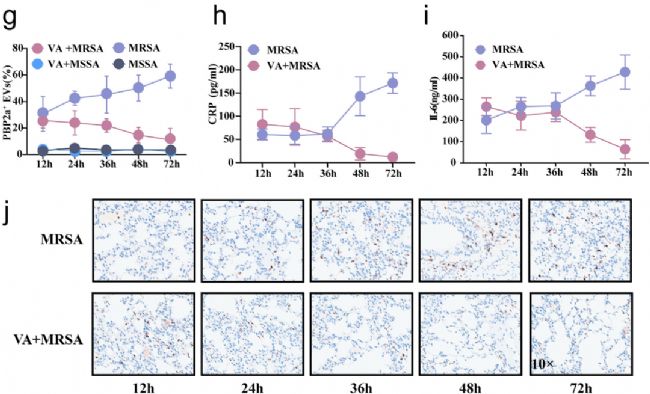 為深入探究抗生素治療 MRSA 期間血液中 PBP2a⁺ EVs 的動(dòng)態(tài)變化。研究團(tuán)隊(duì)采用小鼠肺炎模型,隨機(jī)分為萬古霉素治療組和 PBS 對(duì)照組,在 MRSA 感染后 12-72 小時(shí)內(nèi)多次檢測(cè)血漿中 PBP2a⁺ EVs 的比例。結(jié)果顯示萬古霉素治療組的血漿 PBP2a⁺ EVs 比例呈現(xiàn)逐漸下降趨勢(shì),72 h 時(shí)顯著低于 PBS 對(duì)照組(圖5g)。同時(shí),治療組血漿中炎癥因子水平也明顯降低(圖5h, i)。此外,治療組肺組織中 Ly6G 陽性信號(hào)(中性粒細(xì)胞浸潤(rùn)標(biāo)志)減少,提示肺部炎癥緩解,進(jìn)一步證實(shí) PBP2a⁺ EVs 水平變化可準(zhǔn)確反映治療效果。