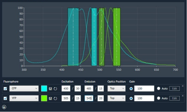 FRET 實驗: CFP 和 YFP 的激發(fā)和發(fā)射波長和帶寬設置