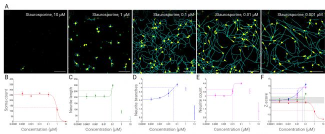 圖 3. 劑量依賴性的神經(jīng)突生長與存活率分析及 Z 分?jǐn)?shù)。(A) 鈣黃綠素 AM 標(biāo)記的 iPSC 衍生神經(jīng)元,用不同濃度的十字孢堿處理。軟件識別并標(biāo)記神經(jīng)元胞體(黃色)和神經(jīng)突(青色)。(B) 至 (E) 展示了十字孢堿處理對胞體數(shù)量 (B)、神經(jīng)突長度 (C)、神經(jīng)突分支 (D) 及神經(jīng)突數(shù)量 (E) 等生長形態(tài)特征的劑量反應(yīng)曲線。(F) 十字孢堿濃度范圍內(nèi)繪制的存活率和神經(jīng)元形態(tài)指標(biāo)的 Z 分?jǐn)?shù)。Z 分?jǐn)?shù)在 -2.3 至 2.3 之間(灰色高亮)的處理組被認(rèn)為與對照組無顯著差異。