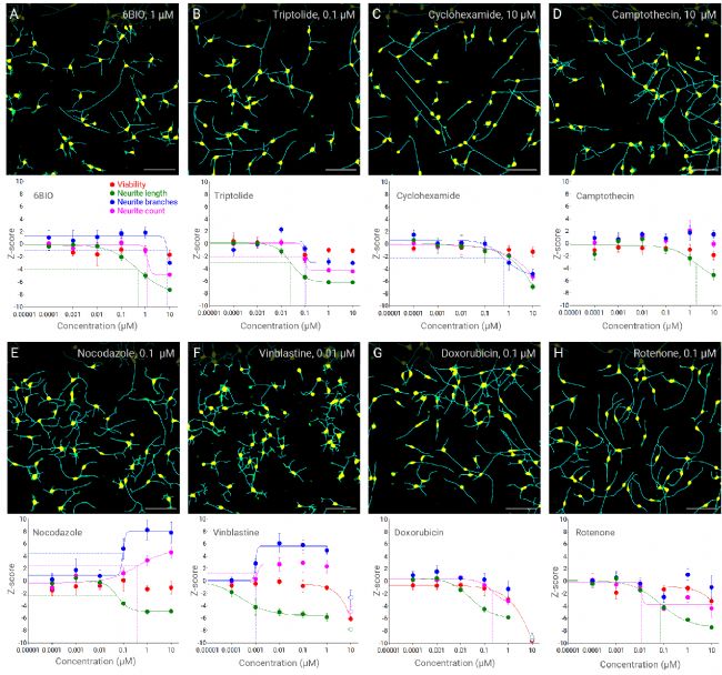 圖 4. 抑制神經(jīng)突生長的神經(jīng)毒性處理。A 至 H 上部為添加標(biāo)記的細(xì)胞圖像:神經(jīng)元胞體(黃色)和神經(jīng)突骨架(青色)。A 至 H下部為每種處理的存活率和神經(jīng)元形態(tài)參數(shù)的劑量-反應(yīng)分析,包括胞體計數(shù)(存活率,紅色)、神經(jīng)突長度(綠色)、神經(jīng)突分支(藍(lán)色)以及每個細(xì)胞的神經(jīng)突數(shù)量(神經(jīng)突計數(shù),粉色)