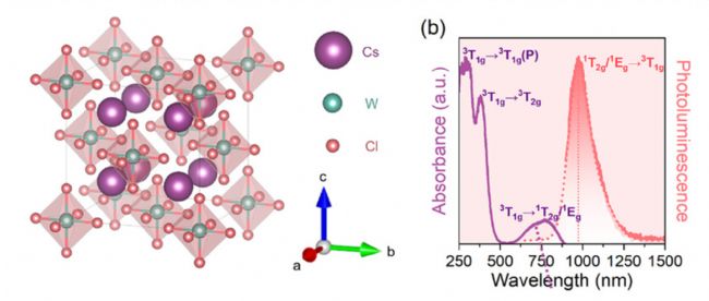 在Cs2WCl6的晶體結(jié)構(gòu)中,該材料以A2BCX6型零維空位有序雙鈣鈦礦框架結(jié)晶(B位點=W⁴⁺;C位點空位),鎢原子與六個氯原子形成八面體配位的孤立[WCl6]²⁻單元(圖1a)。這些被Cs⁺陽離子分隔的八面體單元構(gòu)建出零維結(jié)構(gòu),其空位有序設計會引發(fā)強烈瞬態(tài)晶格畸變,導致體系內(nèi)產(chǎn)生顯著的電子-聲子耦合作用。然而,[WCl6]²⁻八面體的高對稱性通過限制結(jié)構(gòu)畸變抑制了自陷激子(STEs)形成,而W⁴⁺構(gòu)型的強晶體場分裂(10Dq)促進了自旋軌道耦合的d-d電子躍遷。具體而言,近紅外發(fā)射源于宇稱與自旋禁阻的1T2g/1Eg→3T1g躍遷,該躍遷通過振動耦合和相對論性自旋軌道相互作用獲得部分允許。常壓下,Cs2WCl6展現(xiàn)出900-1300 nm的寬發(fā)射光譜,峰值位于973 nm(圖1b)。
