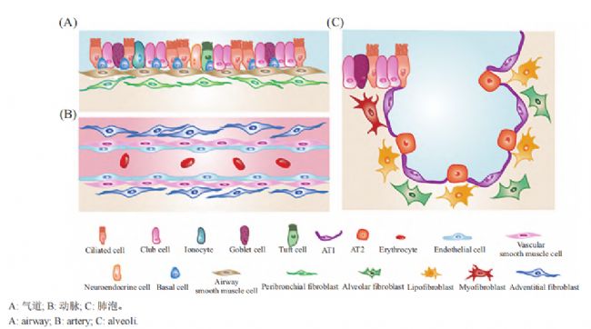成纖維細(xì)胞(Fibroblasts)是結(jié)締組織中最為常見的細(xì)胞類型之一,廣泛分布于皮膚、骨骼、肌肉、內(nèi)臟、血管等組織中。它們在維持組織結(jié)構(gòu)完整性、促進(jìn)傷口愈合以及調(diào)節(jié)免疫反應(yīng)等方面發(fā)揮著至關(guān)重要的作用。肺成纖維細(xì)胞(Lung Fibroblasts)是肺組織中重要的間質(zhì)細(xì)胞,主要分布于肺間質(zhì),主要功能是合成和分泌膠原蛋白以及其他細(xì)胞外基質(zhì)(ECM), 構(gòu)成肺部的結(jié)構(gòu)支架, 從而維持肺組織的穩(wěn)定和強度。肺成纖維細(xì)胞具有異質(zhì)性, 分布在肺臟不同的區(qū)域, 發(fā)揮著多樣的生理和病理功能。根據(jù)成纖維細(xì)胞在肺內(nèi)分布位置以及功能的不同, 可以將肺成纖維細(xì)胞分為支氣管周、動脈外膜、肌成纖維細(xì)胞以及肺泡成纖維細(xì)胞(圖1)。這些不同類型的肺成纖維細(xì)胞在肺部各個區(qū)域中發(fā)揮不同的功能, 維持肺部的生理穩(wěn)態(tài)并參與損傷修復(fù)和組織再生過程。