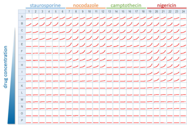 本文研究了四種抗腫瘤藥物(十字孢堿、諾考達(dá)唑、喜樹(shù)堿和尼日利亞菌素)對(duì)細(xì)胞增殖的影響。實(shí)驗(yàn)結(jié)果顯示,四種抗腫瘤藥物對(duì)癌細(xì)胞的增殖和死亡產(chǎn)生了顯著影響。通過(guò) Gen5 軟件生成的細(xì)胞計(jì)數(shù)曲線,研究者們可以直觀地看到整個(gè) 384 孔板中癌細(xì)胞的增殖速率。