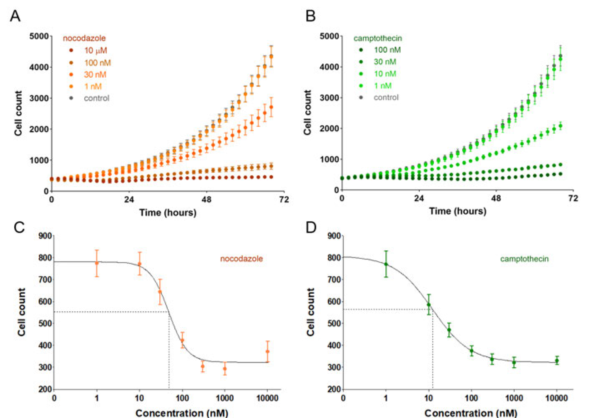 圖2. HT-1080 纖維肉瘤細(xì)胞增殖的劑量依賴性抑制。將幾種濃度的 (A) 諾考達(dá)唑(橙色圓,n = 12 個(gè)重復(fù)測(cè)定孔)和 (B) 喜樹(shù)堿(綠色圓,n = 12 個(gè)重復(fù)測(cè)定孔)在三天內(nèi)的平均細(xì)胞計(jì)數(shù)圖疊加。Agilent BioTek Gen5 軟件生成 (C) 諾考達(dá)唑(橙色圓)和 (D) 喜樹(shù)堿(綠色圓)在 24 小時(shí)的單一時(shí)間點(diǎn)無(wú)標(biāo)記細(xì)胞計(jì)數(shù)的劑量-響應(yīng)曲線。4 參數(shù)擬合用黑色實(shí)線表示, IC50 值用虛線表示。諾考達(dá)唑的 IC50 對(duì)應(yīng)于 48 nM,喜樹(shù)堿對(duì)應(yīng)于 12 nM。