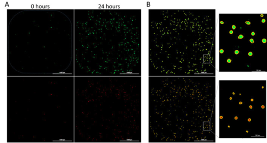 圖 3. 細(xì)胞凋亡和壞死陽(yáng)性細(xì)胞的捕獲和識(shí)別。(A) 兩個(gè)時(shí)間點(diǎn) pSIVA 凋亡標(biāo)志物(綠色,上圖)和 PI 壞死標(biāo)志物(紅色,下圖)陽(yáng)性細(xì)胞的示例圖像。 (B) 通過(guò)細(xì)胞大小和信號(hào)閾值參數(shù)識(shí)別陽(yáng)性凋亡和壞死細(xì)胞,并通過(guò)一級(jí) Mask 識(shí)別陽(yáng)性細(xì)胞。