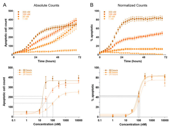 圖 4. 抗腫瘤藥物誘導(dǎo)的細(xì)胞凋亡信號(hào)響應(yīng)。(A) 諾考達(dá)唑在四種濃度下的細(xì)胞凋亡計(jì)數(shù)。由于總細(xì)胞計(jì)數(shù)增加,中間濃度下凋亡細(xì)胞計(jì)數(shù)繼續(xù)上升。通過(guò)絕對(duì)細(xì)胞計(jì)數(shù)生成劑量-響應(yīng)曲線,并擬合至指定的三個(gè)時(shí)間點(diǎn)。由于細(xì)胞增殖,EC50 值隨時(shí)間顯著左移(EC50 24 小時(shí) = 106 nM,EC50 48 小時(shí) = 30 nM,EC50 68 小時(shí) = 17 nM)。(B) 與圖 A 中凋亡細(xì)胞計(jì)數(shù)的數(shù)據(jù)相同,但以總細(xì)胞數(shù)進(jìn)行歸一化(以百分比表示)。數(shù)據(jù)歸一化后,所有劑量-響應(yīng)曲線的 EC50 值均為約 100 nM。在 A 和 B 下圖中,Agilent BioTek Gen5軟件的 4 參數(shù)擬合線以實(shí)線顯示,EC50 插值線以虛線顯示。
