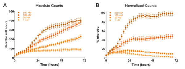 圖 5. 抗腫瘤藥物誘導(dǎo)的細(xì)胞壞死信號(hào)響應(yīng)。(A) 諾考達(dá)唑在四種濃度下的細(xì)胞壞死計(jì)數(shù),(B)數(shù)據(jù)歸一化之后的計(jì)數(shù)結(jié)果。