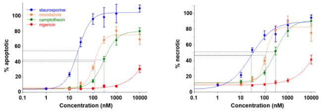 圖 6. 細(xì)胞凋亡和壞死的 EC50 測(cè)定。繪制每種藥物的壞死細(xì)胞百分比(左圖)和凋亡細(xì)胞百分比的劑量-響應(yīng)曲線。Agilent BioTek Gen5軟件進(jìn)行 4 參數(shù)擬合(實(shí)心彩色線)以及插值 EC50 值(虛線)