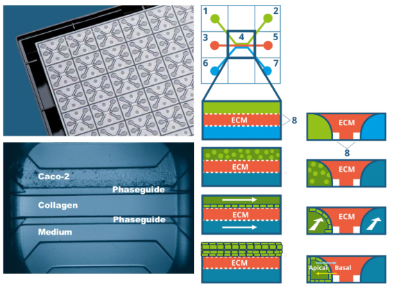 使用人結(jié)腸腺癌細胞系 Caco-2 在器官芯片中制備腸道模型。OrganoPlate® 3-lane 40 的每個芯片由 9 個孔(3 x 3)組成,通過三個微流體通道(寬 400 µm,高 220 µm)連接。