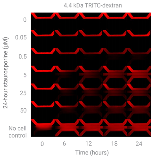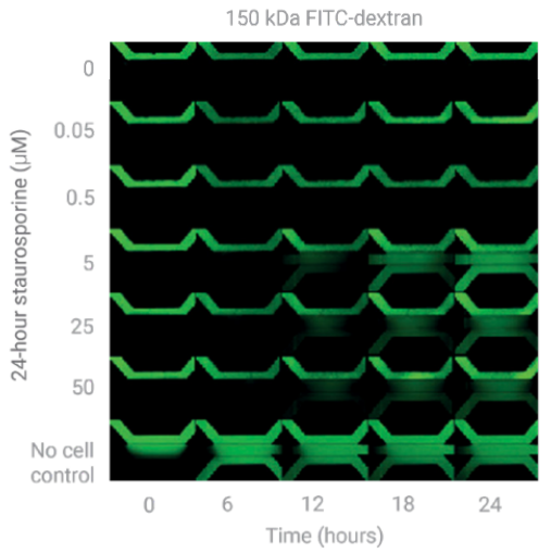 在培養(yǎng)的第 6 天,向培養(yǎng)基通道 1 中加入含有熒光染料(FITC-Dextran 150 kDa,TRITC-Dextran 4.4 kDa)和凋亡誘導劑 Staurosporine(0 至 50 µM)的培養(yǎng)基,并立即使用 BioTek Cytation 1 細胞成像多功能微孔板檢測系統(tǒng)對器官芯片進行成像。
