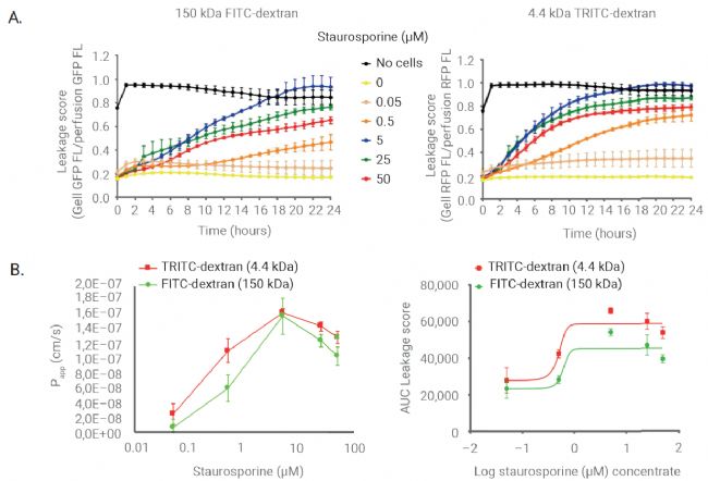 圖 5 顯示在 Staurosporine 處理的細胞中,觀察到劑量和時間依賴性的屏障完整性喪失,表現(xiàn)為兩種熒光染料從培養(yǎng)基向凝膠通道的滲透。通過計算泄露分數(shù)和表觀滲透率(Papp),進一步量化了屏障功能的破壞程度。