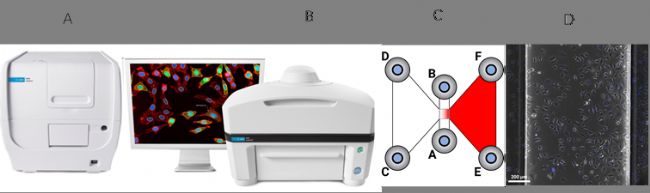 圖:Agilent 成像設(shè)備聯(lián)合 ibidi µ-Slide Chemotaxis 進(jìn)行細(xì)胞趨化實(shí)驗(yàn)檢測(cè)。A:Cytation 系列多功能成像系統(tǒng),B:LionheartFX 智能活細(xì)胞成像系統(tǒng),C:ibidi µ-Slide Chemotaxis 玻片的 A/B 通道成像區(qū)域示意圖,D:Agilent 成像設(shè)備使用 DAPI 和相差通道對(duì)細(xì)胞趨化區(qū)域的成像圖片。