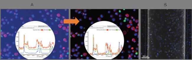 圖:Agilent 的 Gen5 圖像分析軟件對(duì)細(xì)胞趨化的圖像進(jìn)行背景優(yōu)化處理,便于后續(xù)的細(xì)胞軌跡運(yùn)動(dòng)定量分析。A:Gen5 Imge 軟件的圖像去背景處理效果。B:對(duì)細(xì)胞趨化時(shí)間序列圖像進(jìn)行批量去背景處理后的效果。