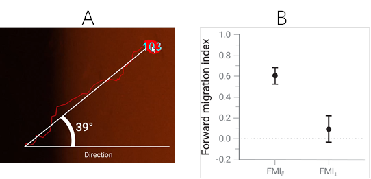 圖:趨化運(yùn)動(dòng)定量統(tǒng)計(jì)結(jié)果輸出。A:Gen5 軟件可自動(dòng)分析獲得每個(gè)細(xì)胞的運(yùn)動(dòng)角度(Direction)。B:通過計(jì)算平行趨化劑梯度方向 (FMIII) 角度和垂直于梯度方向 (FMI⊥) 角度的正向遷移指數(shù)對(duì)細(xì)胞的趨化性進(jìn)行定量評(píng)價(jià)。