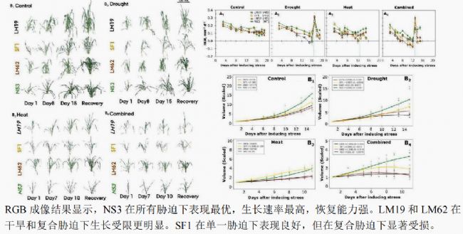 本研究中,根據(jù)熱敏感性篩選出四個(gè)基因型(熱敏感型:LM19、SF1;熱耐受型:LM62、NS3)。研究人員對(duì)分蘗期小麥植株實(shí)施四種脅迫處理:對(duì)照組、干旱脅迫、高溫脅迫及干旱與高溫聯(lián)合作用。干旱處理16天,高溫與復(fù)合脅迫均處理11天,之后3天恢復(fù)期。通過(guò)PlantScreen表型分析系統(tǒng)RGB,對(duì)植物在脅迫早期、晚期及恢復(fù)期的形態(tài)生理特征進(jìn)行了量化評(píng)估。