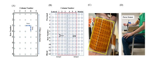 圖2. A:模擬電極矩陣,由具有5列(平行于肌纖維方向定位)和8行的網(wǎng)格組成。B:實驗信號的兩個粘合劑2D矩陣的示意圖。C:用于實驗記錄的高密度表面電極。D:實驗裝置的說明