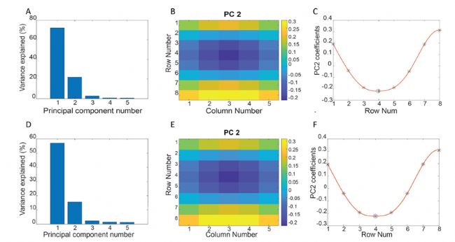 圖6. 從實驗高密度表面肌電信號估計肌肉IZ的一個例子。A:第二主成分系數(shù)的空間分布。對于每一列,最小系數(shù)位于第5或第6行附近,并且系數(shù)沿著纖維方向逐漸增加。B:相鄰雙極信號之間的互相關(guān)系數(shù)的分布。C:雙極信號的均方根分布。D:第1列第2分量系數(shù)的樣條插值。E.第1列互相關(guān)系數(shù)的樣條插值。F:第1列的配對雙極信號的均方根值