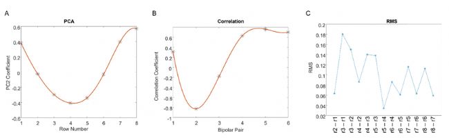 圖5. 當(dāng)一個通道(第3行)被模擬為比單極配置中的其他通道污染更嚴重時,IZ估計結(jié)果。A:第二主成分系數(shù)分析估計了第4行的IZ,與模擬輸入一致。B:互相關(guān)分析估計了第3行的IZ。C:RMS分析估計第4行和第5行之間的IZ