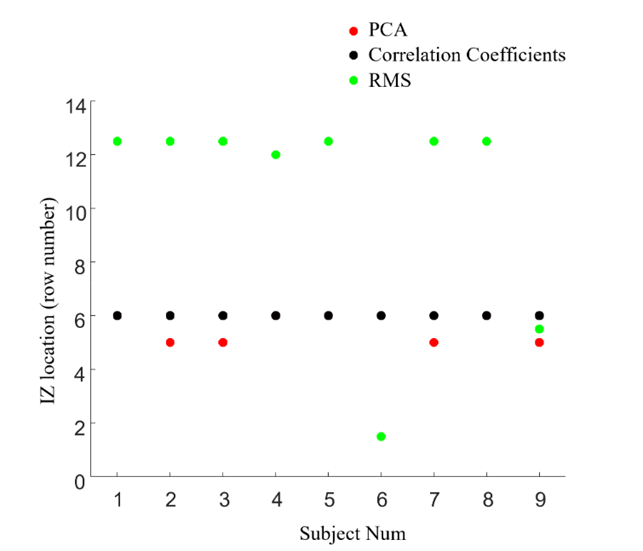 圖8. 從應(yīng)用于實驗性高密度sEMG的一列的不同方法估計的所有受試者的IZ位置的比較