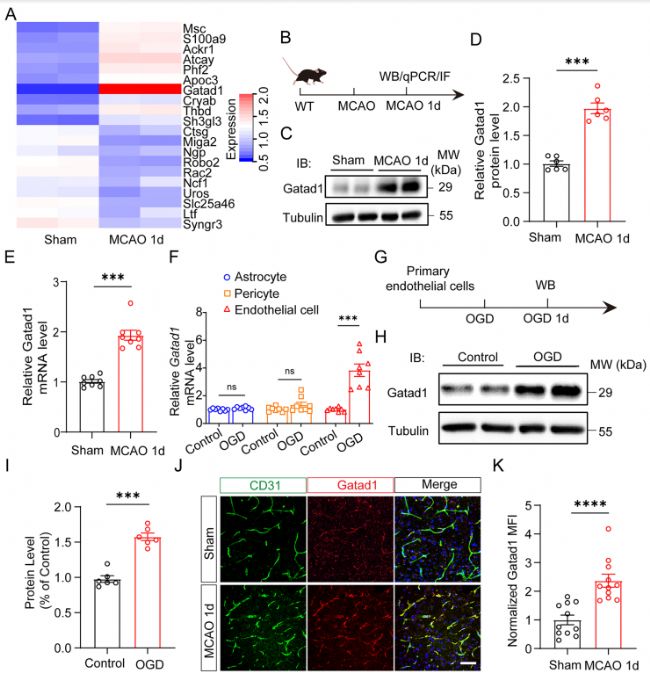 在本研究中,研究人員對(duì)大腦中動(dòng)脈阻塞(MCAO)模型后的小鼠進(jìn)行蛋白質(zhì)組學(xué)分析,成功篩選并發(fā)現(xiàn)了一種GATA鋅指結(jié)構(gòu)域蛋白1(GATAD1)存在顯著變化;GATAD1作為心臟發(fā)育和心血管疾病的重要轉(zhuǎn)錄因子,其在調(diào)控血腦屏障功能及缺血性中風(fēng)中的作用仍不明確。本研究發(fā)現(xiàn),在MCAO模型小鼠的腦微血管中Gatad1的蛋白水平和mRNA水平顯著升高;在體外缺血性損傷模型中,證實(shí)內(nèi)皮細(xì)胞在氧-糖剝奪(OGD)后Gatad1水平升高。