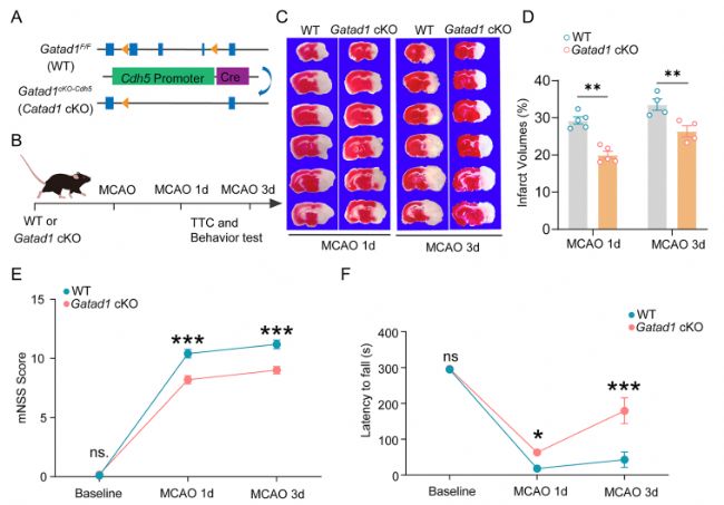 為了探索缺血性中風(fēng)后Gatad1在血管內(nèi)皮細(xì)胞中的病理作用,研究人員構(gòu)建了特異性敲除Gatad1的轉(zhuǎn)基因小鼠。進(jìn)一步研究發(fā)現(xiàn),Gatad1敲除小鼠在MCAO后相比于野生型小鼠MCAO后,TTC染色顯示腦梗死體積減小32%(P < 0.01),行為學(xué)研究顯示神經(jīng)功能缺損情況有所改善。這提示Gatad1的減少存在一定的神經(jīng)保護(hù)作用。