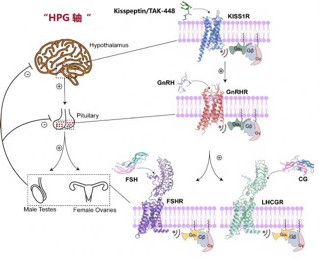 FSHR的內源性配體為FSH(follicle-stimulating hormone),F(xiàn)SH是由垂體前葉分泌的一種糖蛋白激素,是下丘腦-垂體-性腺軸中的主要激素之一。圖3為性腺軸涉及的多種激素與受體。