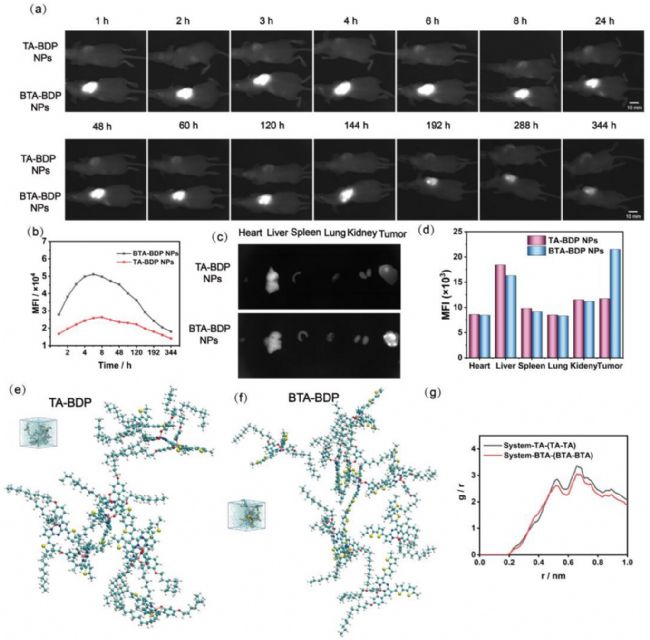 圖7. BTA-BDP NPs荷瘤小鼠研究和分子模擬