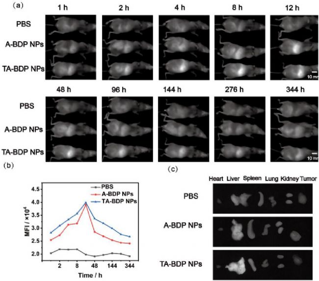 對比分析顯示,BTA-BDP NPs在腫瘤部位產(chǎn)生的熒光信號強度是TA-BDP對照組的1.97倍,可實現(xiàn)治療進程的實時監(jiān)控。藥代動力學分析表明腫瘤積累峰值出現(xiàn)在注射后6小時(圖7a-d),與光熱治療最佳時間窗高度吻合。長達344小時的縱向追蹤檢測到持續(xù)腫瘤信號——這是有機納米顆粒報道中最長的滯留時間,為單劑量治療方案提供支持的同時降低了多藥耐藥風險。