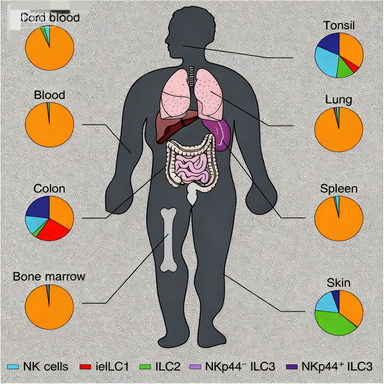 組織分布研究顯示,NK細(xì)胞在大多數(shù)器官中占據(jù)主導(dǎo)地位,僅在皮膚、扁桃體和結(jié)腸等少數(shù)組織中各ILCs亞群分布相對均衡,這一特點(diǎn)也解釋了為何ILC1/2/3的研究相對滯后于NK細(xì)胞。