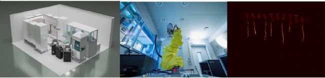 “冥王”(Hades)系統(tǒng)則為一套PlantScreen高通量瓊脂培養(yǎng)植物表型成像分析系統(tǒng)。這是一套專門為瓊脂平板培養(yǎng)植物進(jìn)行自動接種、培養(yǎng)與表型成像分析的系統(tǒng)。該系統(tǒng)為全自動機(jī)器人操作,包括傾倒瓊脂、播種、層積催芽、接種、成像分析全自動運行?扇菁{2160個特制培養(yǎng)皿的全自動全流程高通量表型分析。系統(tǒng)由具備GMO(轉(zhuǎn)基因生物)控制區(qū)的環(huán)控室、操作臺、培養(yǎng)柜(包括層積催芽柜)、機(jī)器人及成像工作站等組成,可進(jìn)行根系形態(tài)成像分析、GFP等熒光蛋白成像分析、葉綠素?zé)晒獬上穹治、多光譜成像分析、高光譜成像(透射光)分析及香豆素?zé)晒飧吖庾V成像分析等
