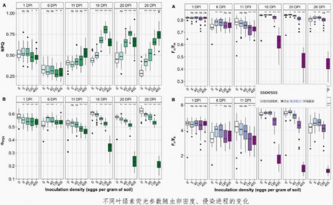 2)高靈敏度: ΦPSII是對低水平侵染最敏感的指標(biāo)。即使在最低接種密度(5卵/克土)下,從第1天起就能檢測到其下降。而NPQ則在第1天對高接種密度表現(xiàn)出響應(yīng)。