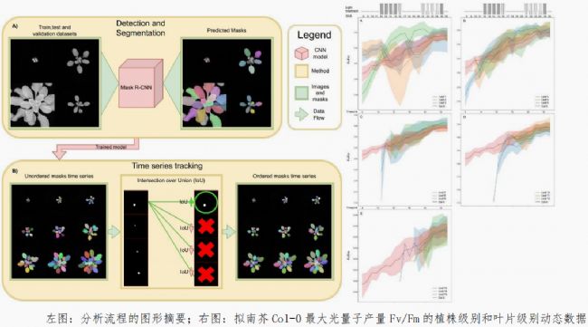 植物光合作用研究對生產(chǎn)力和產(chǎn)量至關(guān)重要。隨著高通量表型系統(tǒng)設(shè)施的發(fā)展,光合表型的測量變得可靠、高效。然而,盡管植物級別的表型分析已自動化,但葉片級別的信息通常仍依賴于手動標(biāo)注,限制了研究效率。本研究提出了一種新方法,用于在植物(以擬南芥為例)的頂部拍攝圖像時間序列中,對單個葉片進(jìn)行自動檢測、分割和追蹤。
