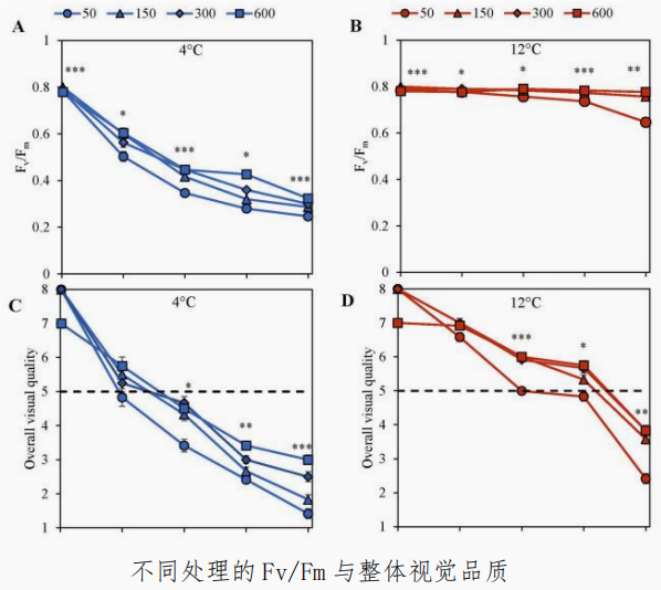 利用FluorCam葉綠素?zé)晒獬上裣到y(tǒng)測量后發(fā)現(xiàn),羅勒葉片最大光化學(xué)效率Fv/Fm在4°C貯藏下顯著下降,但EOP光強(qiáng)對其無顯著影響。Fv/Fm反映了植物光合反應(yīng)中心在脅迫條件下的損傷程度,是目前衡量植物受脅迫程度與抗性高低最靈敏的指標(biāo)之一。因此,結(jié)果表明,EOP高光可有效提升羅勒的營養(yǎng)價值(碳水化合物、迷迭香酸、抗壞血酸),但未能增強(qiáng)羅勒的耐冷性。