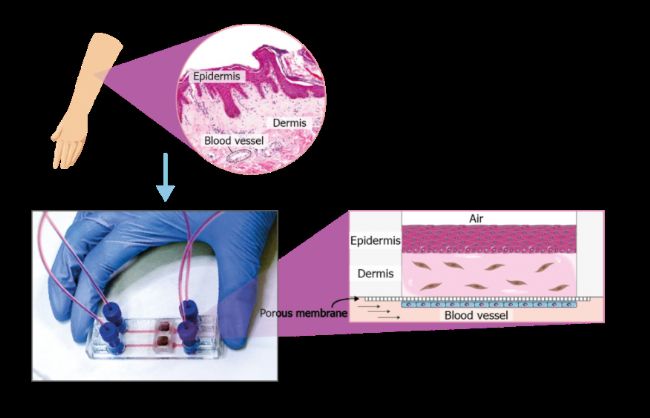 圖1顯示了如何在微流控設(shè)備中重建芯片上皮膚模型的示例。該裝置可以通過(guò)多孔膜將培養(yǎng)井與微流控通道連接起來(lái),從而研究復(fù)雜的培養(yǎng)結(jié)構(gòu)。在這個(gè)裝置中,可以重建灌溉皮膚組織的血管,覆蓋分離通道的膜,并與內(nèi)皮細(xì)胞很好地進(jìn)行結(jié)合。真皮主要由膠原和成纖維細(xì)胞組成,利用水凝膠中成纖維細(xì)胞的三維培養(yǎng)進(jìn)行模擬。在水凝膠聚合后,我們可以在氣液界面培養(yǎng)一層角化細(xì)胞。這種培養(yǎng)條件有利于不同層系的外延生長(zhǎng)。