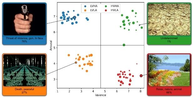 圖1. 位于效價和喚醒量表上的四個類別中刺激樣本的分布和示例。藍(lán)色為低價高喚醒(LVHA),綠色為高價高喚醒(HVHA),橙色為低價低喚醒(LVLA),紅色為高價低喚醒(HVLA)。示例圖像下面是它們的標(biāo)簽和眾包圖像特定分類精度,N=8