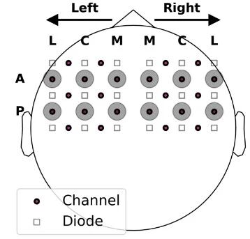 圖2. fNIRS通道和二極管放置。該分析僅使用了用灰色圓圈突出顯示的通道,這些區(qū)域分為前部(A)和后部(P)額葉區(qū)域,并且每個半球通道分為外側(cè)(L)、中央(C)和內(nèi)側(cè)(M)