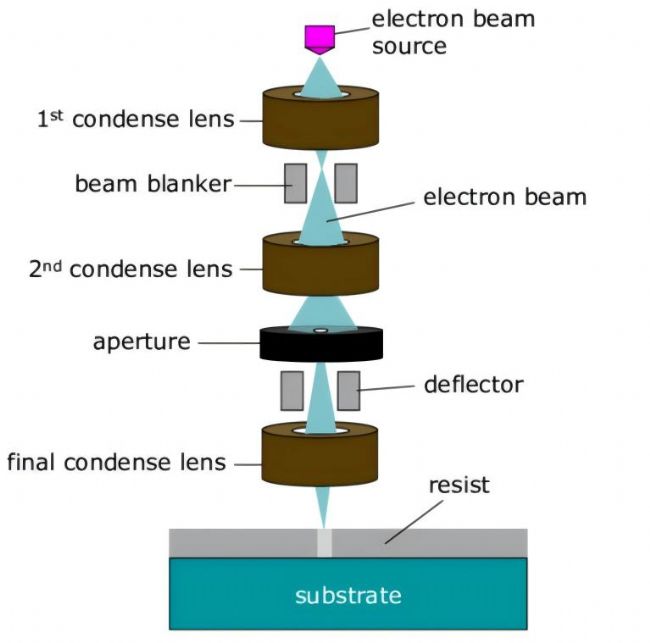 電子束直寫(EBL)技術(shù)利用電磁透鏡將電子束聚焦成納米尺度的束斑,通過計(jì)算機(jī)控制的電磁偏轉(zhuǎn)線圈引導(dǎo)電子束在光刻膠表面掃描曝光。對(duì)電子敏感的光刻膠(電子膠)在受到電子轟擊后會(huì)發(fā)生化學(xué)變化。