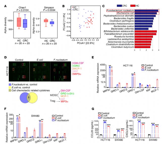 圖1:(A)采用 Chao1 指數(shù)和 Simpson 指數(shù)對結(jié)直腸癌組(CRC 組,n=20)和健康對照組(HC 組,n=20)進行α多樣性分析。(B)在物種水平上對結(jié)直腸癌組(n=20)和健康對照組(n=20)進行主坐標(biāo)分析(Principal Coordinate Analysis,PCoA)。(C)采用線性判別分析效應(yīng)量法(discriminant analysis effect size,LEfSe)篩選結(jié)直腸癌組(n=20)與健康對照組(n=20)間的標(biāo)志物種。藍色柱形和紅色柱形分別代表在結(jié)直腸癌組和健康對照組中富集的菌群標(biāo)志物種。(D)采用人細胞因子抗體芯片檢測經(jīng)具核梭桿菌或大腸桿菌處理后的 HCT116 細胞條件培養(yǎng)基(CM)中炎癥因子的變化情況。方框內(nèi)顯示的是與免疫細胞趨化相關(guān)的差異細胞因子,方框下方為細胞因子芯片韋恩圖。(E、F)實時熒光定量聚合酶鏈反應(yīng)(qPCR)分析顯示,結(jié)直腸癌細胞與具核梭桿菌、大腸桿菌共培養(yǎng) 6 小時后,細胞因子表達發(fā)生變化(n=3)。(G)酶聯(lián)免疫吸附試驗(ELISA)檢測結(jié)直腸癌細胞與大腸桿菌、具核梭桿菌共培養(yǎng)后 CCL20 和 CXCL3 的分泌情況(n=5)。*P < 0.05,**P < 0.005,***P < 0.0005。