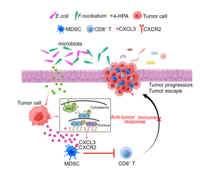 結(jié)論:作者揭示腸道微生物代謝產(chǎn)物4-HPA通過激活JAK2/STAT3信號通路,促進結(jié)直腸癌細胞分泌趨化因子CXCL3,從而招募免疫抑制性的多形核髓源性抑制細胞(PMN-MDSCs),抑制CD8T細胞的抗腫瘤活性,最終促進結(jié)直腸癌進展及免疫抑制微環(huán)境的形成(如上圖2)。