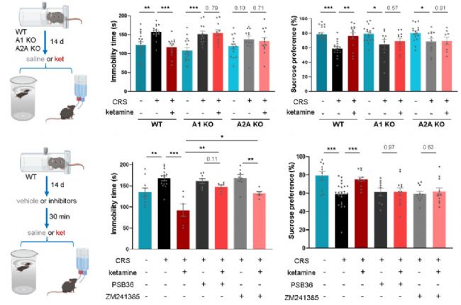 圖2. 遺傳學(xué)與藥理學(xué)手段證明腺苷信號(hào)介導(dǎo)了氯胺酮的快速抗抑郁表型