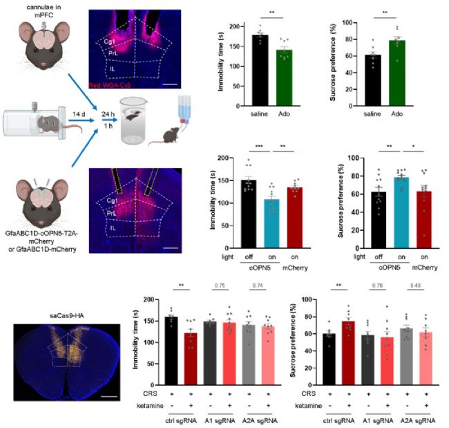為進(jìn)一步確定腺苷信號(hào)的作用腦區(qū),研究者進(jìn)行了環(huán)路層面的功能驗(yàn)證。實(shí)驗(yàn)發(fā)現(xiàn),直接向內(nèi)側(cè)前額葉皮層內(nèi)注射腺苷,或利用光遺傳學(xué)技術(shù)特異性激活該區(qū)域的星形膠質(zhì)細(xì)胞以誘導(dǎo)內(nèi)源性腺苷釋放,均足以在抑郁模型小鼠中產(chǎn)生快速的抗抑郁行為效應(yīng)。相反,利用AAV介導(dǎo)的CRISPR/Cas9技術(shù),特異性在內(nèi)側(cè)前額葉皮層敲低A1或A2A受體,則阻斷了全身給予氯胺酮所產(chǎn)生的治療效果。這些結(jié)果共同表明,內(nèi)側(cè)前額葉皮層是腺苷信號(hào)介導(dǎo)快速抗抑郁作用的關(guān)鍵節(jié)點(diǎn)。
